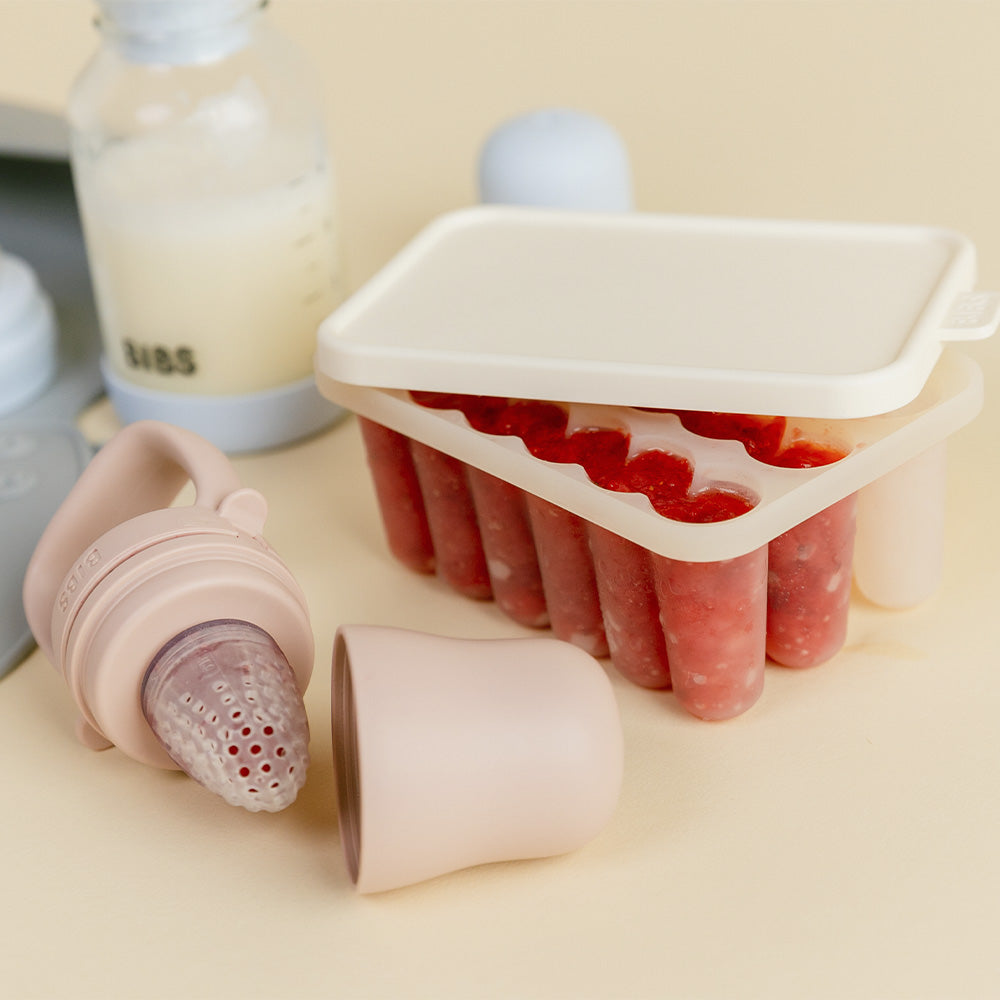 Simple. Just fill up the Freezer Tray with something yummy - fruit smoothies, vegetable purées, breastmilk or anything else you think your baby will like - and put it into the freezer. (Make sure you only fill up the tray to the ‘MAX’ line or else the it can be a bit difficult to close the lid!) Then, when tummies start to rumble, simply pop a cube into the BIBS Baby Feeder silicone nipple, and your little one will take care of the rest.