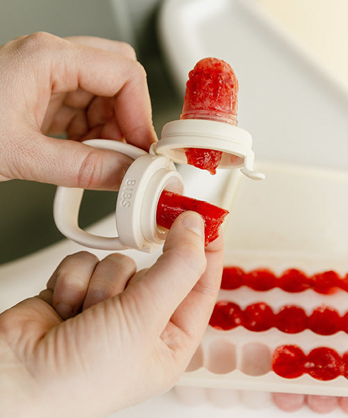 Tamaño ideal para snacks fríos: Compatible con cubitos de nuestra bandeja para congelar comida de bebé para un alivio refrescante.