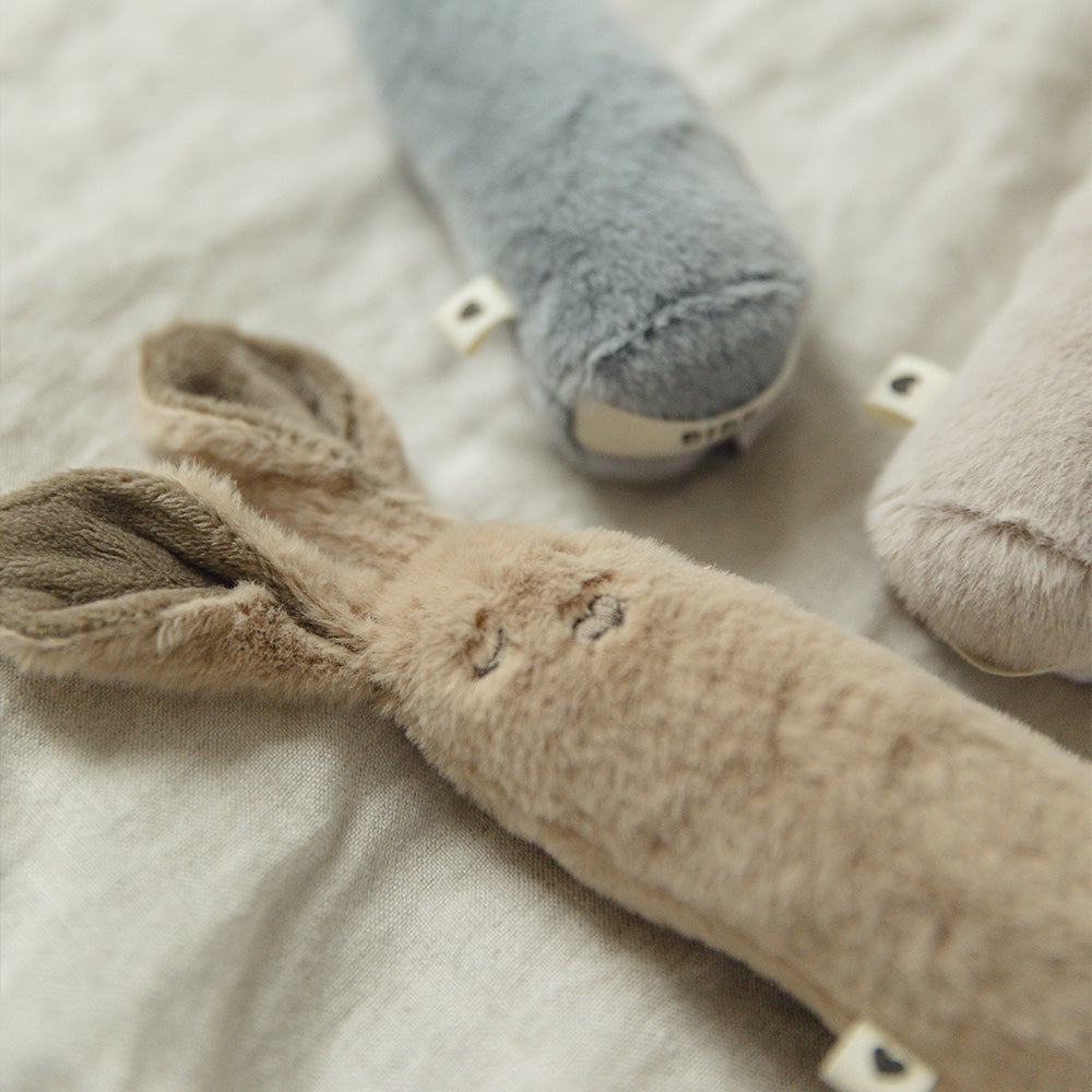 - Tauste un sajūtas: Piedāvājiet dažādus materiālus, piemēram, mīkstās rotaļlietas, teksturētas sedziņas vai kādu no Grab and Explore rotaļlietām, lai bagātinātu bērna taustes izjūtas.